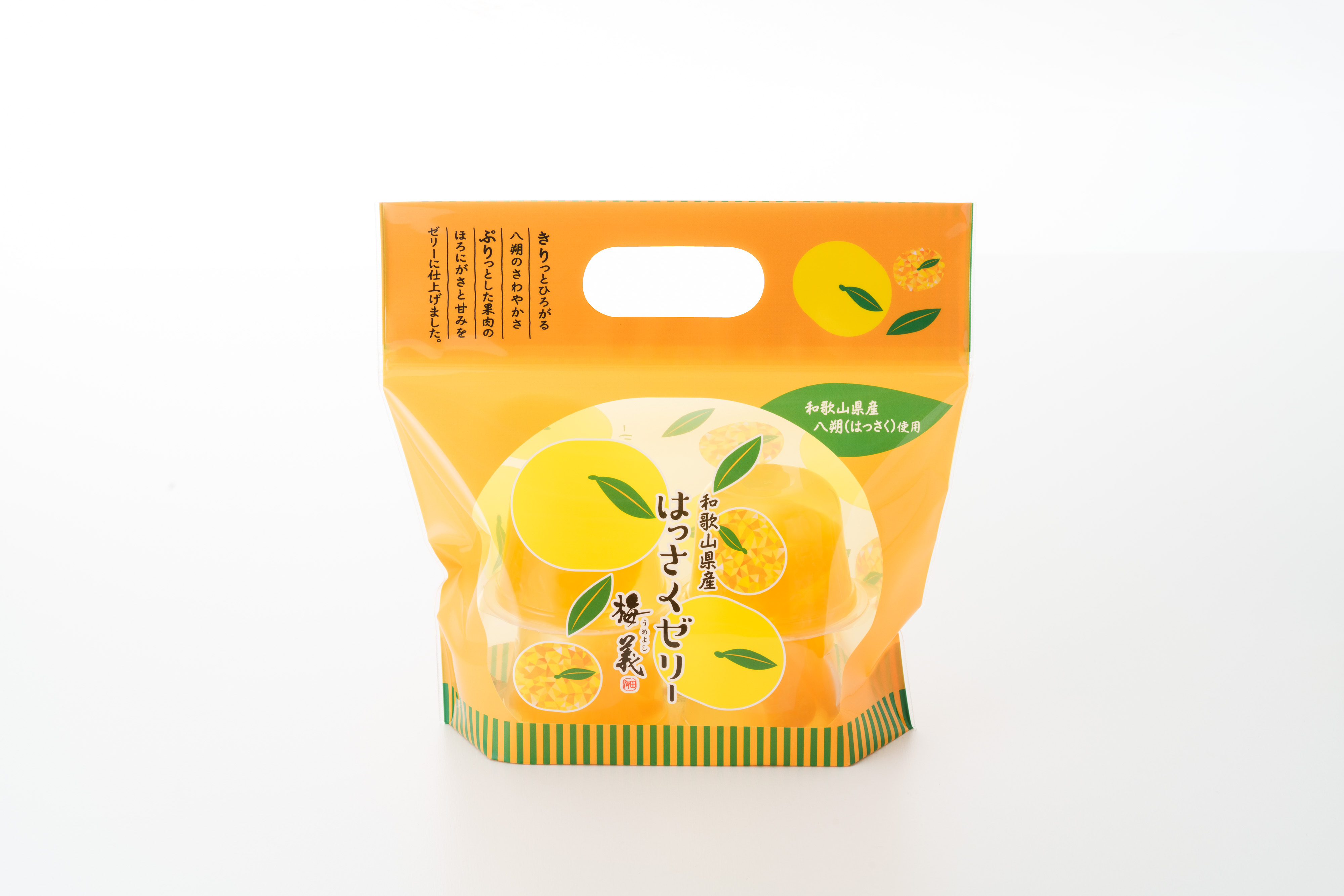 原材料:はっさくシラップづけ(はっさく(和歌山県産)、砂糖)、砂糖、はっさく果汁/ゲル化剤(増粘多糖類)、乳酸カルシウム、酸味料、酸化防止剤(ビタミンC)、香料