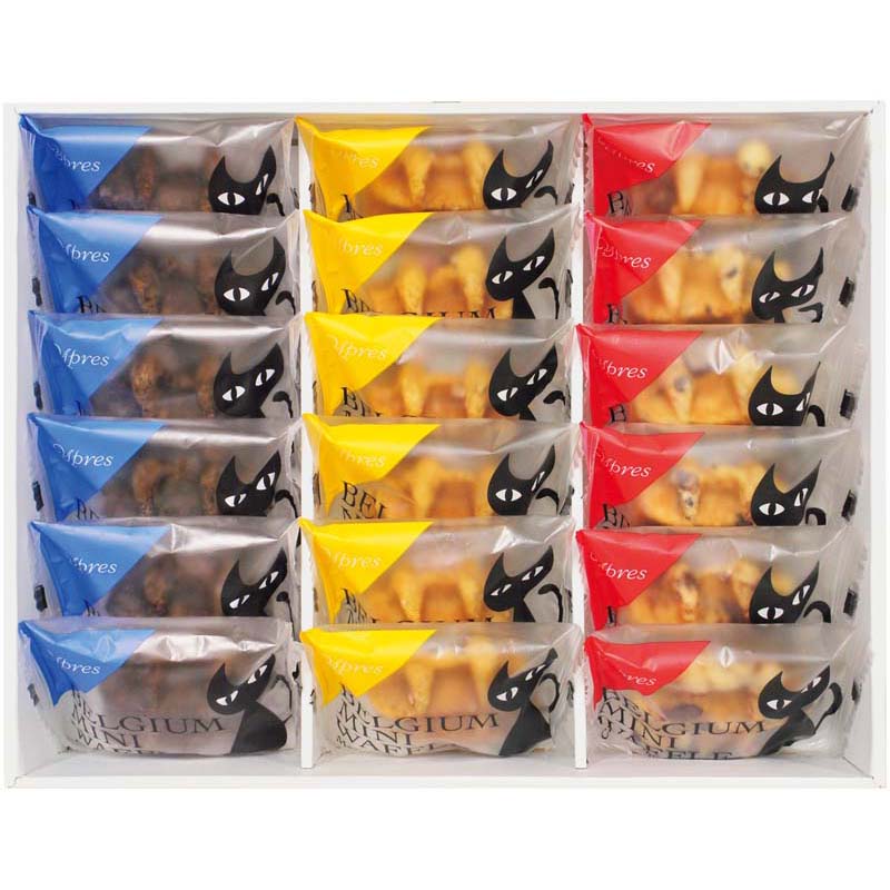 小さめサイズのワッフルがたくさん入った、みんなで楽しめるギフトです。黒猫のパッケージが楽しさを演出します。