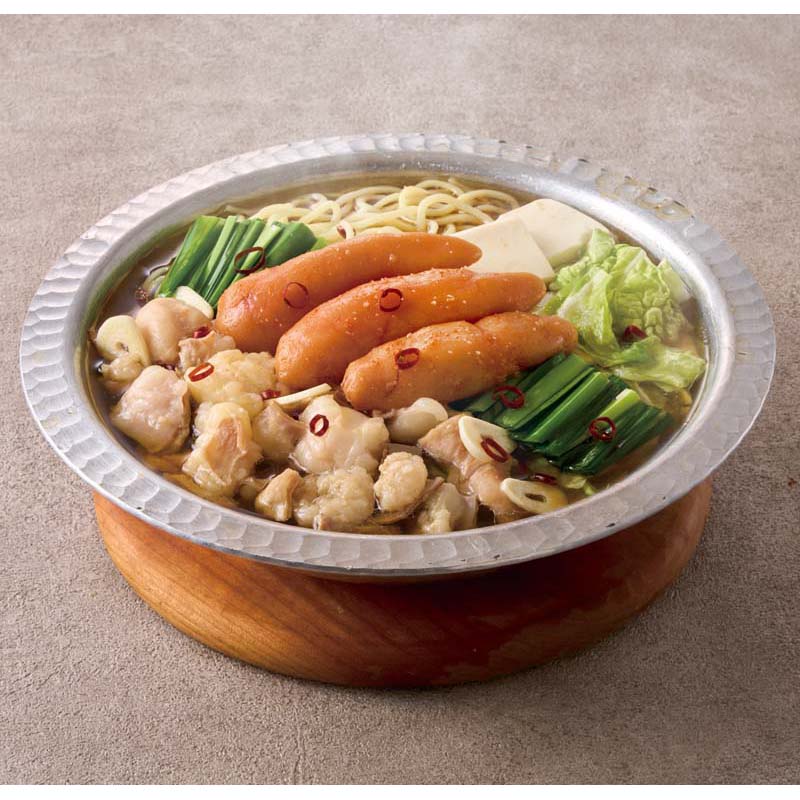 博多を代表する無着色辛子明太子と博多もつ鍋に、たっぷりのにんにくをかける背徳感たっぷりの鍋セットです。