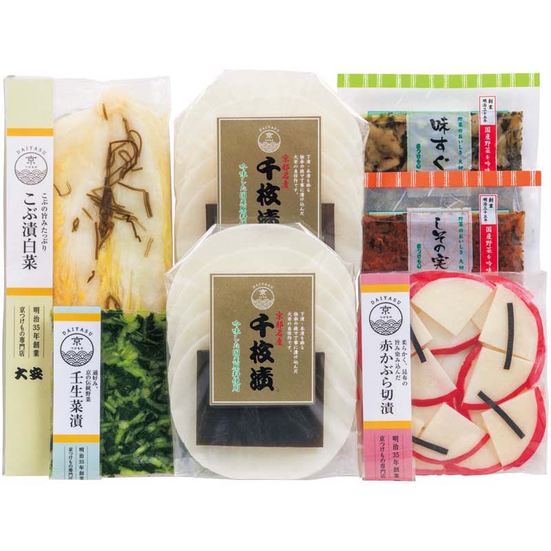 京都の代表的な漬物「大安」の千枚漬を中心に旬の野菜を取り揃えました。大安は、明治35年創業の京つけもの専門店です。漬け込む野菜は全国各地の契約農家や市場から吟味して仕入れた、国産野菜だけを使用し、素材本来の風味を生かしたこだわりの味づくりをしています。