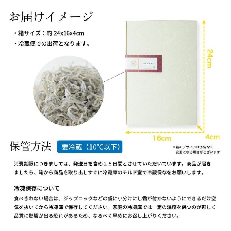 海の恵みをたっぷり浴びじっくり天日干!受け継がれてきた製法で加工。 しらすの旨味が噛めば噛むほど味わえるおいしさ!紙箱入りとなっております。_冷凍保存の場合、1回分小分けにして凍らし保存して下さい。