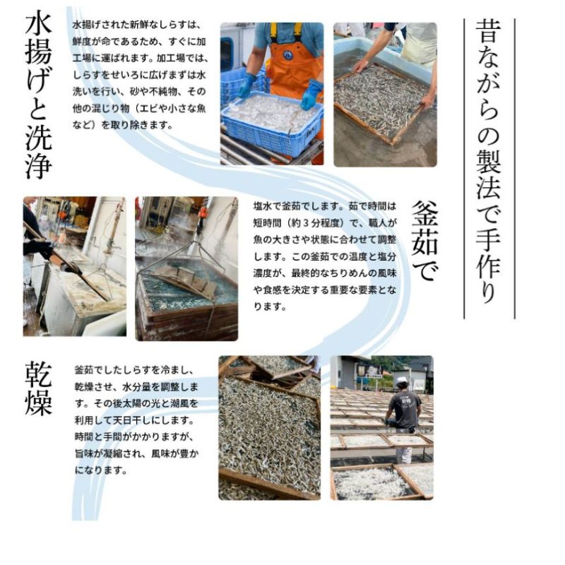 通常のちりめんより大きく育ったしらすです。ほど良い歯ごたえが特徴で、噛むほどにほろ苦く奥深い旨味が広がります。
