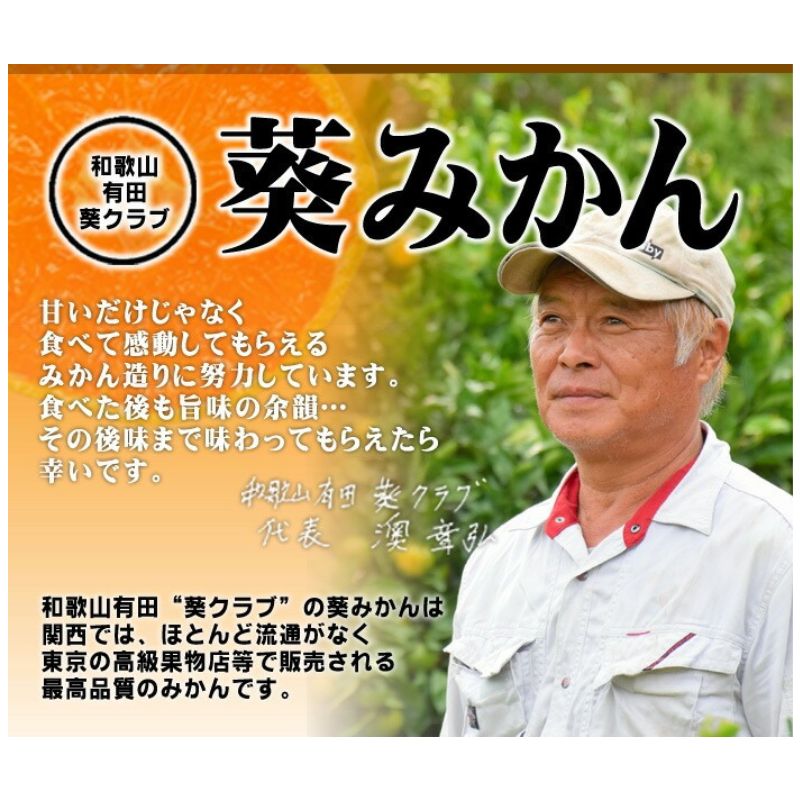 和歌山有田葵クラブ「葵みかん」甘いだけじゃなく 食べて感動してもらえるみかん造りに努力しています。食べた後も旨味の余韻・・・その後味まで味わってもらえたら幸いです。和歌山有田葵クラブ 代表 澳 章弘和歌山有田葵クラブの「葵みかん」は関西では、ほとんど流通がなく 東京の高級果物店等でのみ販売される最高品質のみかんです。葵クラブのこだわり一、健全な苗木で改植高糖系の新品種を選抜し、バイオテクノロジーにより ウイルスを無毒化した健全な苗木で改植を行っています。二、有機肥料での栽培鰹節用に身を取った後の骨や内臓などの良質な魚粕を直接取り寄せ、 それをオリジナルの機械で粉砕し肥料としています。三、有機アミノ酸液肥の散布有機アミノ酸液肥および、液糠を散布することにより、みかんの樹の健全化 を図っています。四、樹上での完熟栽培果実の本当の旨味を引き出すため、樹上で完熟させてから収穫します。五、高畝栽培による高品質果実生産天候に左右されないみかん造りのため、改植時には畑の基盤整備として高畝にしています。葵みかん、その味わい葵クラブのこだわりから造り出された「葵みかん」は、 甘味・酸味のバランスはもちろん「旨味」たっぷり!「美味しい!」を超えた思わず「旨い!」と言ってもらえるように、 日々努力し、労苦を惜しまず造り出された逸品のみかんです。一度食べると忘れられない味わい!是非ともご賞味くださいませ。
