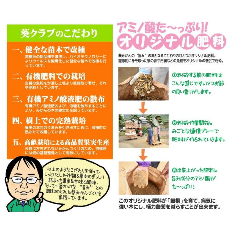 和歌山有田葵クラブ「葵みかん」甘いだけじゃなく 食べて感動してもらえるみかん造りに努力しています。食べた後も旨味の余韻・・・その後味まで味わってもらえたら幸いです。和歌山有田葵クラブ 代表 澳 章弘和歌山有田葵クラブの「葵みかん」は関西では、ほとんど流通がなく 東京の高級果物店等でのみ販売される最高品質のみかんです。葵クラブのこだわり一、健全な苗木で改植高糖系の新品種を選抜し、バイオテクノロジーにより ウイルスを無毒化した健全な苗木で改植を行っています。二、有機肥料での栽培鰹節用に身を取った後の骨や内臓などの良質な魚粕を直接取り寄せ、 それをオリジナルの機械で粉砕し肥料としています。三、有機アミノ酸液肥の散布有機アミノ酸液肥および、液糠を散布することにより、みかんの樹の健全化 を図っています。四、樹上での完熟栽培果実の本当の旨味を引き出すため、樹上で完熟させてから収穫します。五、高畝栽培による高品質果実生産天候に左右されないみかん造りのため、改植時には畑の基盤整備として高畝にしています。葵みかん、その味わい葵クラブのこだわりから造り出された「葵みかん」は、 甘味・酸味のバランスはもちろん「旨味」たっぷり!「美味しい!」を超えた思わず「旨い!」と言ってもらえるように、 日々努力し、労苦を惜しまず造り出された逸品のみかんです。一度食べると忘れられない味わい!是非ともご賞味くださいませ。