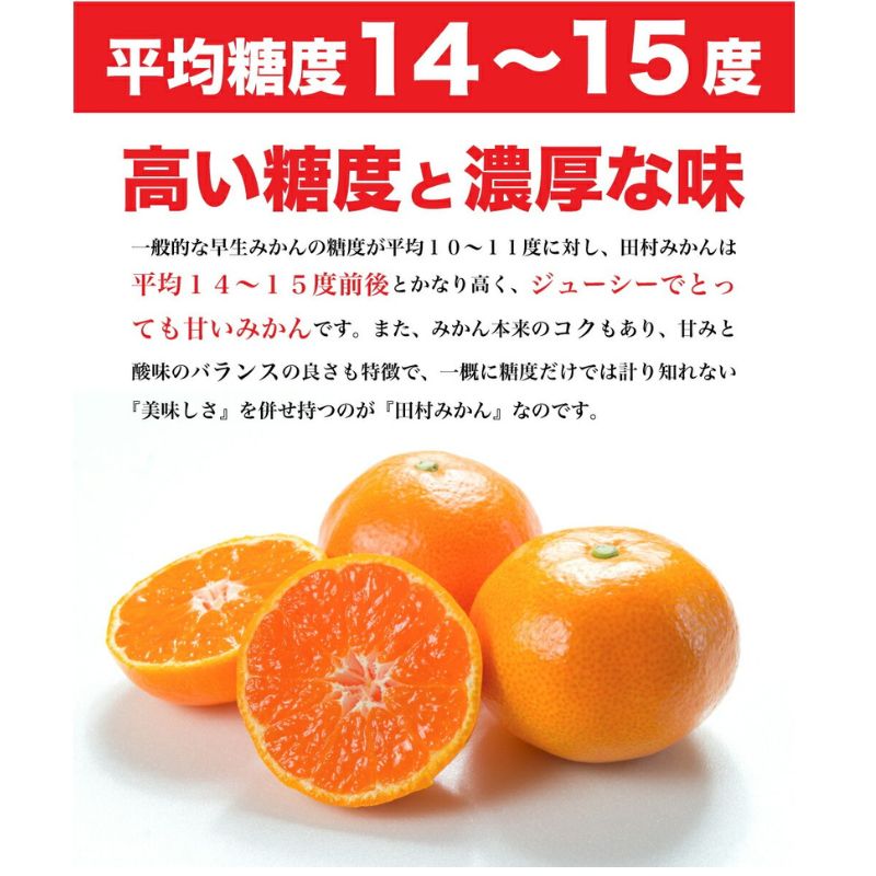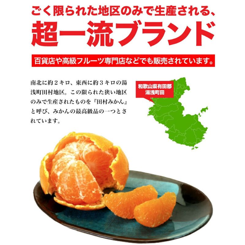 ごく限られた地区のみで栽培される超一流ブランド!百貨店や高級フルーツ店などでも販売されています。「和歌山県有田郡湯浅田」南北に約2キロ、東西に約3キロの湯浅田村地区。 このごく限られた狭い地区のみで生産されたものを 「田村みかん」と呼び、みかんの最高級品の一つとされています。
