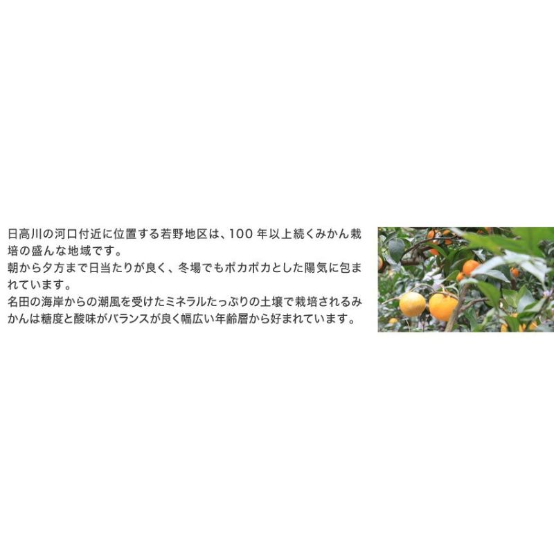 和歌山県日高郡日高川町(旧川辺町)若野産の幻のみかん! 知る人ぞ知る、味だけにこだわった幻の若野ミカン!味が濃く深みのある甘さ、ジューシーな果汁がたっぷり。「若野みかん」というと、あまり聞きなれない方が多いと思いますが和歌山県日高川町の「若野みかん」は、和歌山のみかんの代名詞ともいえる有田みかんにも勝るとも劣らないおいしさがあります。有田地方に近く土壌の質や環境も有田地方のそれに酷似している若野地方で、若野地方独自のこだわりを持って育てられたみかんは数多く和歌山のみかんを食べていたバイヤーですらその果肉の甘さやジューシーな果汁、糖度と酸味のバランスの絶妙さに驚いたほど。しかし今までこのみかんを手に入れる事が出来る流通経路は限られていたため一般の方が手に入れるのは難しく幻のみかんとも言われていました。ここ最近やっと安定して皆様のお手元にお届けする事ができるようになり販売に漕ぎ着けました、是非この幻とも言われるみかんのお味をお試しくださいませ。
