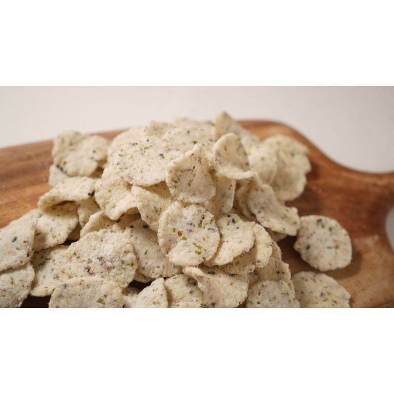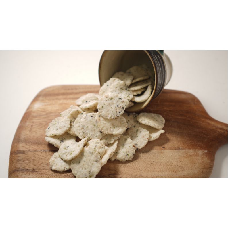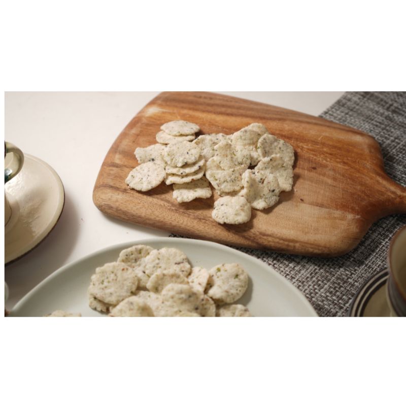 馬鈴薯澱粉(馬鈴薯(国産))、植物油、カタクチイワシ、えび、食塩、砂糖、ごま、アオサ、醤油、粉末昆布、発酵調味料、でん粉分解物、酵母エキス、チキンエキス/加工でん粉、コーラルカルシウム、調味料(アミノ酸等)、膨張剤、甘味料(ステビア)、(一部に小麦・えび・大豆・鶏肉・ごまを含む)